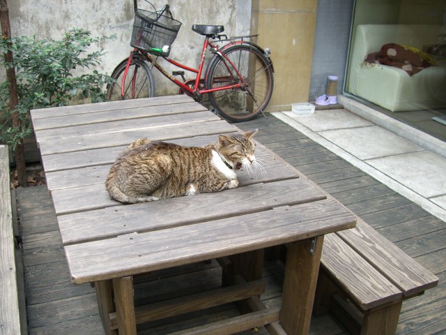 先日、4泊5日で台湾へ行ってきましたぁ~!!友人がネットで調べて、台湾でも人気のネコカフェ(何箇所もあるらしい)その中でもネコちゃんが多い所に行ってきました。歩いて探すこと1時間。。。民家の中にあり、これじゃあ見つけられないよ!!っていう所にありました。ねこちゃんは居るかなぁ~~??入り口に、1ニャン発見!!ここにも。このねこちゃんは、帰るまで2時間ずっと寝ていました。店内は、思っていたより綺麗で、臭いもあまりありませんでした。コーヒーやサンドイッチなど軽食もあって、台湾食が苦手な人にもOK!!外も自由に行き来できて、店内には7ニャンほど。丁度、子猫(5匹)も生まれたばかりでラッキーでした♪抱っこもできます。ネコちゃんが寄って来れば、の話ですが。私には来ませんでしたけど(汗)。。残念。ですので、お友達のIさんの写真を勝手に載せちゃいました。もちろん、おもちゃも持って行きましたよぉ~おなじみ「ネココロリ」と「座布団」 (^^)Vネココロリ台湾初上陸!!やっぱ、ここでも大人気!!うちのネコ共より食いつきがいい!?高速ねこキックにはビックリしましたが。。。(^^;)言葉は分かりませんが、お店の人も興味を持ってくれた様でした。お土産にプレゼントしてきました。たくさん遊んでくれるといいなぁ~♪