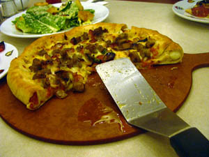 今日は晩ご飯を食べにSMの中にあるピザハットへ行ってきました。フィリピン生活2回目のピザハットです。学生のニックさんと一緒に行ってきました。外食をあまりしない(できない?)のでどこがおいしいとかどこに何があるとか全くわからないと~こです ピザが大好きなのですが、フィリピンのピザの耳は分厚くて食べにくいというのが私の印象でした。だから耳は残す派です。でもでも、今日食べたピザは「ボルケーノ(火山)」と言ってピザの耳の中にチーズやらサラミやらが包んであるので耳が苦手な私でもおいしくいただくことができました。なんで、ボルケーノと言うのかはわかりません。 日本にもあるかしら?????日本のピザハットはもっぱら宅配専門ですよね???イートインがあるかしら????フィリピンは宅配もあるし、レストランもあるのでどこでも食べられます。 よ~く見ると耳の中にチーズとサラミが見えますよ このボルケーノは普通のピザのオプションとして+120ペソくらい出せばできます。そして、欲張りな私たちはメニューになかったけど「ハーフ&ハーフ」ができるかな?と学生に聞いてもらい、店員が「できる」と言ったので2種類の味とボルケーノを堪能しました。 お会計の時、私たちがソラで計算していた600ペソをはるかに下回る440ペソでした。「思っていたより安いね~」と言いながら会計を済ませてよくよくレシートを見るとボルケーノの追加料金などが加算されていなかったんです。それに気付いた私たちは「じゃ、早く家に帰りましょう」と言ってそそくさと店を出ちゃいました 食べた料金より高かったら文句を言うけど安かったら言わない。ラッキーなのかわかりませんがおいしくいただけたので善しとしましょう 余談ですが、ここのピザハットの男性店員はみんなおかまちゃん。店長もおかまちゃんでした。歩くとわかるし、しぐさも女の子。でも、姿は男。店長がおかまちゃんだから自然と集まるのかしら??? 前に、ニックさんが、エマンさん(柔道してた学生)と一緒にピザハットで食べたのですが、食べた分の予算しか持っていなくてサービス料金や税金分が払えなくて困ってた時店長に相談したらすぐにOK。払わなくてもよくなったそうです。ニックさんが言うにはエマンさんが男前だったから。「じゃあ、もし私だったらダメだね、女だから」っておかまちゃんに女は通用しません。