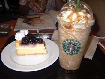 アヤラで買い物を終えた私らは夜勤明けで眠いのに付き合ってくれたトイくんとバイバイして タクシーで10分くらいのところにあるビジネスパークのスタバへ行きましてん。 そのスタバでランチの時に会ったサイルスくんと待ち合わせして再会しましてん。(サイルスくんは私がおかまっぽいって言った人) 彼は、医療器具のセールスマンでスタバでお客さんとパソコンしながら話してましたわ。 私らはスタバでスナックしましてん 1年以上ぶりかなぁ。スタバするんわ キャラメルフラペチーノとブルーベリーチーズケーキをいただきました。 スタバはおいしいね。(やっぱり高いけど) キャラメルフラペチーノは一番大きいサイズ(146ペソ) ブルーベリーチーズケーキは(99ペソ)でした。(たぶん) スタバを後にした私とキンとサイルスくんはまた、アヤラへ アヤラにある「来来軒」で晩ご飯を食べましてん。 2回目の「来来軒」今晩は「シーフード弁当とサーモンの刺身」をいただきました。 今日、私よ~く考えるとシーフードばっかり食べてましてん。 気付かないうちに注文してるんですわ。 魚介類に飢えてるのは事実っす シーフード弁当の中身はきすのフライともやし炒めそれから貝とえびの甘い炒め物とまぐろのお刺身それからお味噌汁とごはんごはんは日本米でした やっぱり日本のお米はおいしいですわ 今日食べた料理はどれも美味しかったっす。 カガヤンデオロにも「来来軒」があるからまた行こうっと♪(高いけど。。。) これで私のセブ12時間の滞在記は終わりです。 食べてばかりのセブ滞在でした でも、つづきがあります。 次はフェリー乗船記?