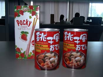 今日は、日本からわれらのボスが来ました 彼が持ってきてくれた日本のお土産 ↓↓↓ 缶に入ったおでんです。 でもなんでか「銚子風」 銚子風やなんて初めて聞きましたぁ どんなんかなぁ~ どんな味かなぁ~ あとで食べようと思います。 想像やと、関東風の濃ゆめのしょうゆ味かなぁ??? あと、期間限定のポッキー「つぶつぶいちご」 いちごはあまりフィリピンあらへんので しばらく食べてへんのです このポッキーでいちご味を思い出そうと思います。 今日は、日本からのお客様も来てはるので バタバタしていますねん。 そして、前にご紹介したボクサーの土山君の 試合も今晩ありますねん。 今日は たくさん日常変化の風が 私の周りに吹いておるんですわ あ、そうそう、新しい学生も昨日の夜 カガヤンデオロに到着して 今日はオリエンテーション 明日から日本語のお勉強ですねん それから、あの反抗Tシャツを着ていたNiCkさん いよいよ今日、日本語トレーニングが修了します。 3月始めぐらいには日本に行けるでしょう。 日本に行く前に色々、準備しないとあかんので すぐには行けへんのです こんな慌しいオフィスも いいもんです。 新鮮な風が心地いいですねん
