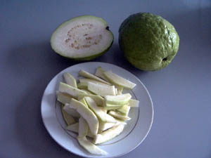 ここ最近、毎月数個グアバを食べていますねん。 お友達が家の庭になっているのを 私にいつもくれはるんです。 他のお友達の家の庭には マンゴーやパパイヤの木や バナナの木があるそうなんですわ フィリピンならではの家庭菜園かしらん? このグアバは最初、ちょっと抵抗があったんです。 グアバってお茶のグアバ? そのイメージしかなくて くだものなんか、野菜なんか 得体のしれへんもんを口にするのは やっぱりねぇ・・・ それに、だいぶ前にタンブブアンという村に行った時に食べた グアバは若かったせいか めちゃめちゃ渋くって硬くって 食べられたもんじゃなかったんです その苦い経験から食べるの遠慮しようかと思ったんですが でも、体にいいからなぁ~と思って 食べてみたら結構イケるんですわ。 お友達がくれるグアバは熟れているものなのでおいしかったんです。 ちょっと渋みのあるりんごっぽいです。 ビタミンが豊富らしいんで やっぱり体にいいんですよねぇ よく冷やして わたしはマヨネーズをつけて食べてます。 マヨネーズが健康によくないって言わんといてくださいね そのままでもおいしいですよ 日本にもグアバって売ってるんかなぁ??? 今日もお友達がオフィスまでグアバを持ってきてくれました