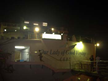 日本から一時帰国してはったYehlenさんが 明日、日本へ帰国するために 今晩カガヤンデオロ港からセブに向けて出発しましてん。 出港は8時 クラスが終わって見送りに駆けつけたんですが 一足遅く もう船に乗ってしもうたんです でも電話して さよならを言って 船の甲板から手を振ってくれましてん 夜で暗かったし 船は遠くて よく見えへんかったけど 確かにYehlenさんたち Yehlenさんの家族と恋人のAriesはセブ空港まで見送りに行くから みんなで船に乗っていましてん 日本に帰っちゃうとしばらくフィリピンに帰れないから 家族も寂しいですねんね。 月曜日に会った時「ワタシハ 日本デ ガバッテル、 ***ハ フィリピンデ ガバッテル、ダカラ オネジネ」 彼女はそう言ってちょっと寂しそうでしてん。 私は「彼女も頑張ってるから私も頑張るぞ!!」と 改めて思いましてん