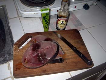 今日、SMに行って鮮魚コーナーを見ていたらまぐろがありましてめっちゃめちゃ食べとうなりました。それで思い切って買っちゃいましたそんでもって頭の中はねぎとろ丼 店員さんに頼んで1匹のまぐろをおろしてもらいました。でもね、でもね、「ブロック」を頼んだのに私の想像してたものと全然ちゃうもんを手渡されましてん。↓↓↓ 日本じゃこんな切り方せ~へんと思うんですが外国じゃ~このスタイルですねんでも新鮮と信じて早速ネギトロもどきのまぐろ丼を作ることに・・・わさび&キッコーマンのお醤油を買うたんです。まぐろは70ペソわさびは96ペソお醤油は47ペソでした。わさびの方がまぐろより高いっすね。トロの部分欲しかったんですが店員さんは捨ててしまいはりましてん・・・ そして出来上がったどんぶりはこちら↓↓↓ 結構な量のネギトロもどきやったんで残りは自己流の刺身にしましてん。 魚もそうですが、生の魚を調理したんが初めてやったんで徹底的にわさび醤油に漬け込みましてん。だから全部同じ色・・・おねぎが売ってなかったのが残念 食べた感想は・・・一口目・二口目はおいしかったんですけど後は同じ味が続いて途中で飽きてしもうたんです。それにちょっと生臭かったんですわ たぶん、もう作らへんと思います日本でおいしいネギトロ丼を食べるまで封印します 明日、ちょっぴりお腹が心配なと~こでした