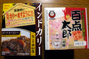左は、新宿中村屋のレトルト・インドカリー。「志望校に受カリーますように!!」右は、栃木県宇都宮市のあづま食品(知らない)の納豆。「がんばれ受験生!百点太郎 必勝」何で受験かと言うと、パックの脇に、「受験生応援メニュー ねばり勝ち!満点納豆丼」 買いませんでしたけど、♪おやつはカール♪も売ってました。「うカール」ですって。受験競争は日本もアジア諸国も、他の国も(?)それぞれに、それなりに激しいのでしょうが、こういう風に、商戦が絡んでしまうのって、どこの国でもそうなんでしょうかね。コンビニは今、受験と、バレンタインと、節分、恵方巻。恵方巻も、いつからか完全に風物詩になったけれど、これ、最近ですよね。少なくとも関東は。どうなんでしょう、こういうの。