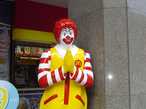 タイのおじさん。さすが、拝んでいる。これはシンガポールのおじさん。さすが開放的。これも。あっちこっちに色々なポーズのおじさん。マクドナルドを「マック」と言うか、「マクド」と言うか。私は関東人なので、どちらかと聞かれれば「マック」ですが、でも、普通は「マクドナルド」とフルネームで呼んでいます。癒し系ですね、彼は。