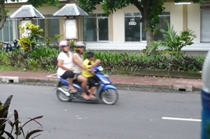 これは“たったの”三人乗りですが、 1.運転するお父さん、 2.荷台に座るお母さん、 3.お父さんの前に一人 子供(立っている)、 4.お母さんの前に一人 子供(座っている)、 5.お母さんの背中に一人 子供(背負われている)、という合計五人乗り、珍しくないです。(写真撮れなかったんですが。)2008/02 Bali島。(この間の三連休の前日の夜発ち、次の日の早朝に帰ってきて、 …出勤した。。)