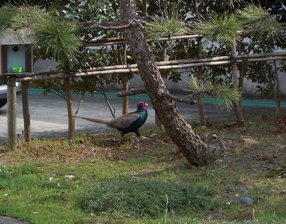 気温は25℃近くまで上がり天気は良いものの風があり目がとても痒い一日となりました本を読んでいるとネコが窓から別の窓に走ったので庭に何が来たのかと窓の外を見るととても珍しい場面が見られましたエサを食べに来た キジバト と散歩に来た キジ が通路で遭遇数十センチの距離ですれ違っていました急いでカメラを向けたものの時すでに遅し2羽は知らん顔ですれ違って反対方向に離れていきキジバト はエサ小屋へ キジ は庭の端の方に向かっていました首が濃い紫色でピッチピチの若鳥です