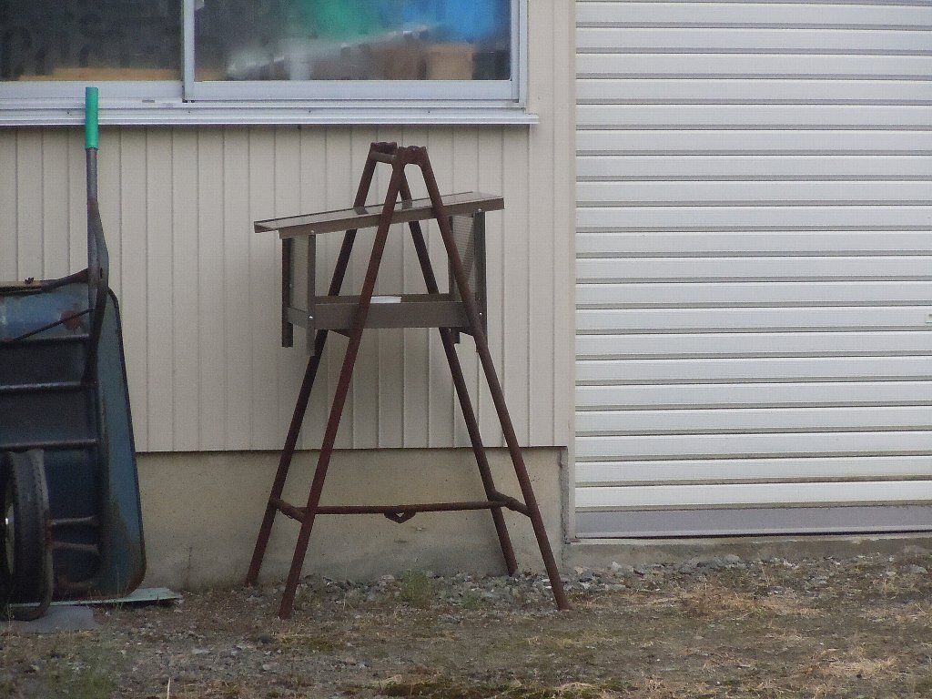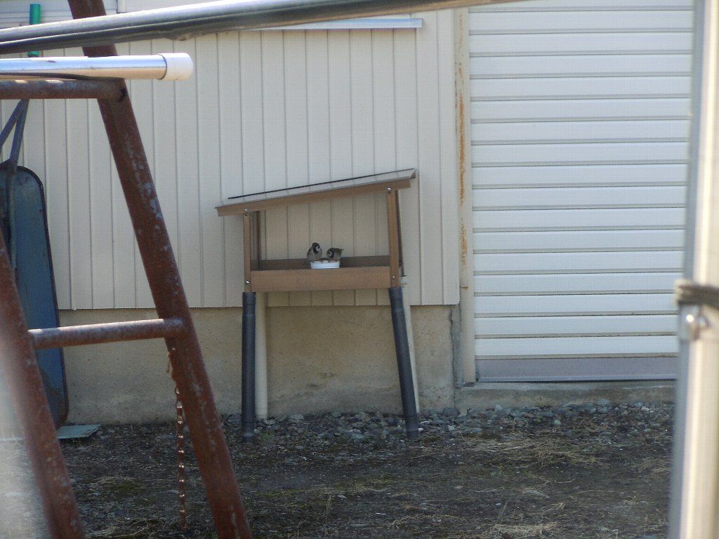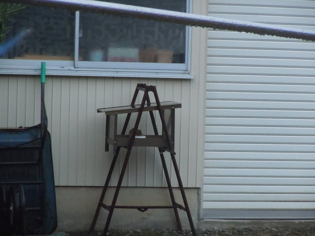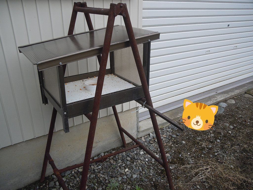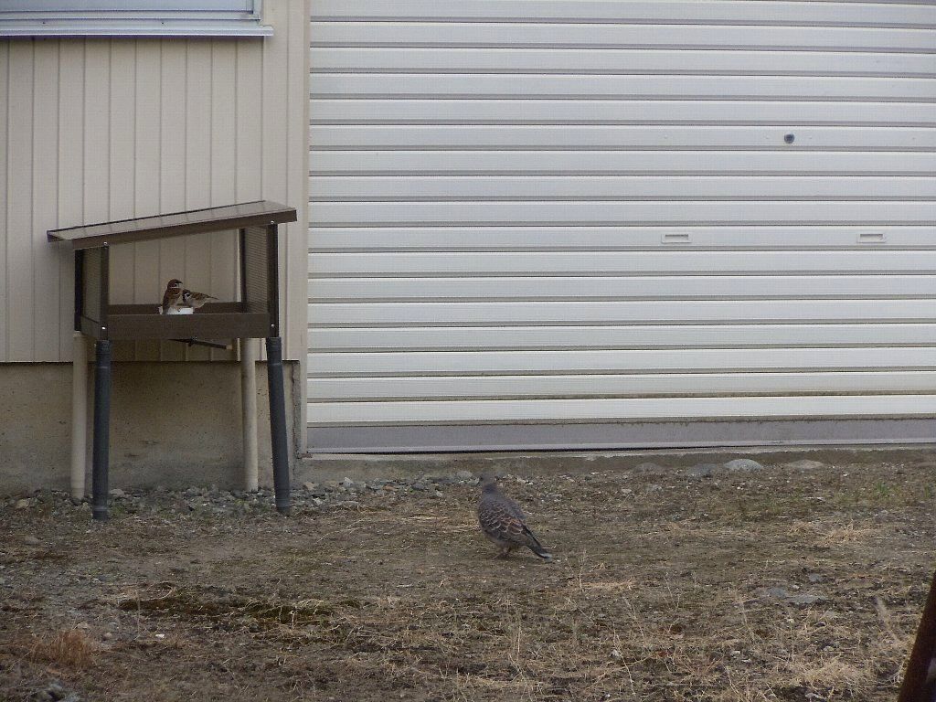 昨日までの良い天気が一転朝から小雨で風がありほんの少し肌寒くも感じますネズミが来てしまったエサ小屋2号ウォッチングの場所としては最適だし常連客となった鳥たちのことを考えて場所はそのまま地面から高さのあるところが良いだろうと使っていなかったハシゴ兼用脚立 に設置してみました脚立を広げた内側にちょうど納まったのですただ脚立は雨ざらしになっていたため錆びついてデコボコしているのが足場となってネズミも上れるのではないかと不安は残ります (-_-)朝食用のエサを補充するとまるでどこかで見ていたかのようにスズメとキジバトが同時にやってきましたスズメ2羽とキジバト1羽はエサ小屋2号のあった場所をウロウロ上部にあることに気が付いていないのか双眼鏡で見ているとキジバトはまさにハトが豆鉄砲を食らったような顔 ( 笑 )スズメはすぐに気が付きましたスズメは地面に置いてあった時のように小屋から出たり入ったりすることなく危険性は少ないと感じているように見えますスズメは問題なしキジバトは置いてあった場所をウロウロするばかりもしかしたら上にあるのに気づいていてもまだ警戒しているのかもしれません