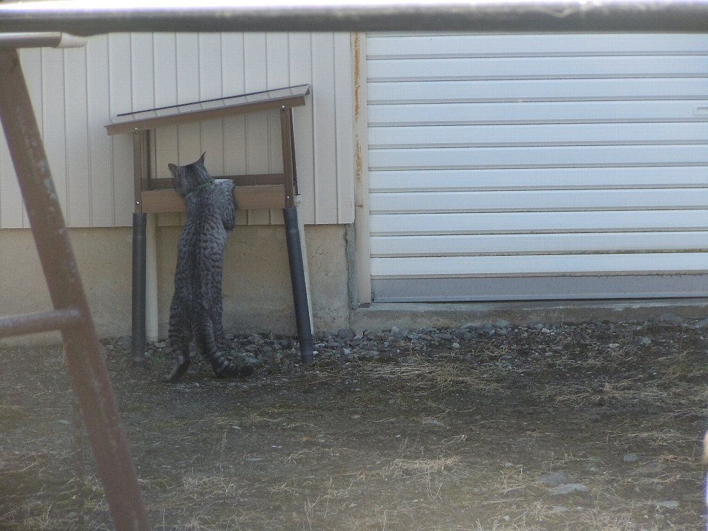 昨日は早朝からチュー太郎に振り回されました脚立により高さを確保しても 錆びつきと傾斜 が問題かもという不安が的中したのでしたならば小屋の脚が垂直に近ければ少しはマシかなと簡易処置として4脚にパイプのゲタを履かせてみました真直ぐではないのが気掛かりですが (^-^;それにチュー太郎の ジャンプ力 がどの程度なのか見当がつかないので高さがまだまだ足りないかもしれないしゲタのパイプの滑り具合も足りなさそうな不安も残っています ☆ ☆ ☆今朝はチュー太郎が来ないかと台所に立ちながらチラ見していましたが昨日のエサの残り具合をみると来ていなかったようですエサの補充は朝7時過ぎですが6時を過ぎると朝食時間帯が同じなのかキジバトとスズメがほぼ同時にやってきますキジバトはエサ小屋1号に停まったもののエサは補充前でほとんど残っていないためかエサ小屋2号のスズメの食事の様子をじっと見ていましたスズメがいなくなるとキジバトは2号に近づき最初の頃のように小屋の屋根と地面を行ったり来たり脚立と一緒に補助棒も外してしまったので小屋に入れないようですまだ朝食にありつけていないためなかなか諦めきれずに挑戦していましたが再び1号の木に戻り口惜しそうな顔をしていました ( 笑 )イソップ寓話の 【 キツネとブドウ 】 を思い出し笑って見ていると急に飛び去ってしまいましたエサ小屋2号にキジバトには嬉しくない客が来たからです近所のネコが散歩に来て覗き込み 小屋が倒されないかとヒヤヒヤでした ( 笑 )この高さでキジバト用に補助棒を付けると が上がり易くなりそうな気がします