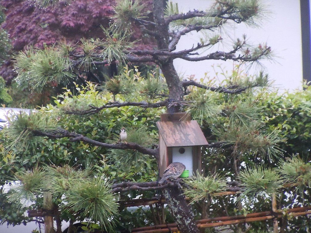 まだ五月晴れと言えるほどの青空がないのに梅雨の走りのような小雨模様が続いていて緑色が重々しさを増しています安定した食事にありつける場所を知ったキジバトは早朝から頻繁にやってくるようになりスズメの声もよく聞こえるようになりました今朝もエサを補充して10分ほどするといつの間にかキジバトが来ていてキジバトのそばにはスズメも待機スズメは オナガ に追われているのを見ますがキジバトとの仲は悪くないのでしょうか食事中のキジバトに何度も近付いていましたが・・・食事中のキジバトに睨まれたスズメが上の枝に移動したところですスズメは地面に置いたエサ小屋2号の方に頻繁に降りていますがやはりキジバトに少し遠慮しているのでしょうか1号でエサを食べていたキジバトは2号にスズメを見つけ地面に降りて2号に向かって歩いていくと食事中のスズメは屋根の上へ