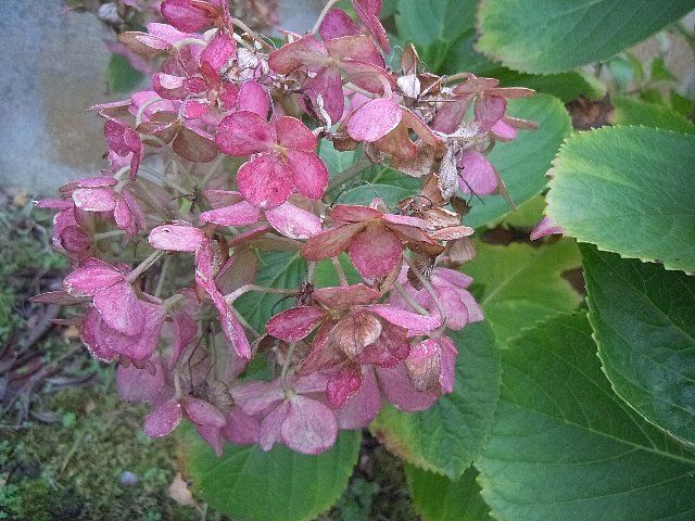 朝晩は肌寒く軽く暖房を入れています真夏の間であれば涼しくて心地よい気温なのに身体はもう冬仕様に向っているようですね紫陽花 はシーズンを終えても花は散りません枯れてしまった姿をいつまでも晒しているのが無惨で可哀想だと思っていましたしかし2か月ほど前に寄った和風の店にわざわざ 《 枯れ紫陽花 》 と称して茶色くなった紫陽花が飾ってありその斬新さに驚いたのでした一昨年だったか裏庭にあった紫陽花を剪定( 切っただけ ) した際切り取った一本の枝を家の前の塀沿いに植えておいたものが昨年から花を咲かせるようになりました枯れてゆく姿を何となく目にしていたのですがこの時期になって花が色付いてきました茶色い枯れ姿から色を復活させる生命力に驚きですこれが普通なんでしょうか? 紺予約掲載