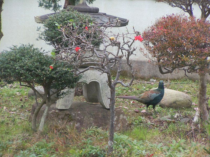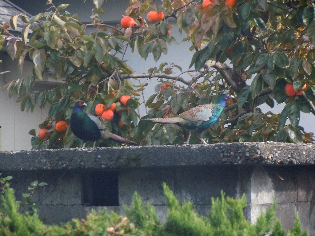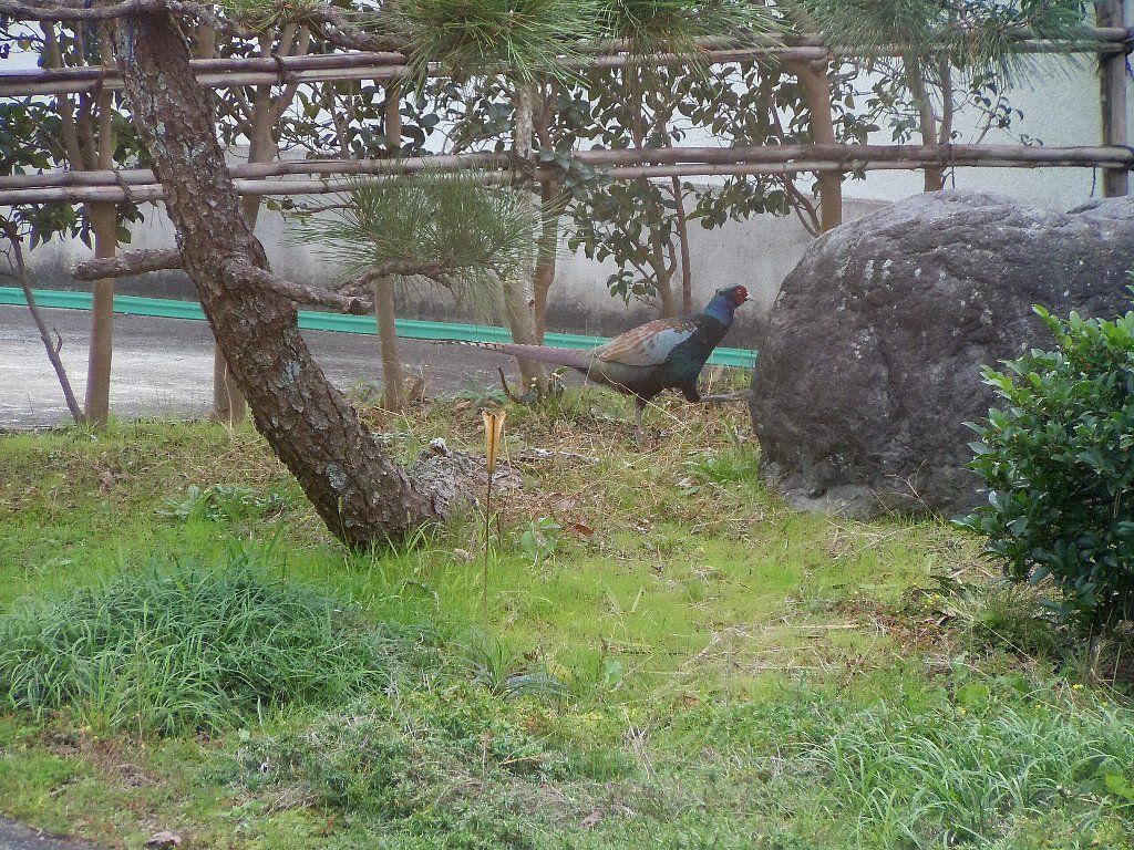 穏やかな秋の日は昨日までのようで今日の昼頃から天気は下り坂の予報気温も下がってくるそうです窓から外を見ていた ネコ が急に別の窓に走ったので常連の スズメ や キジバト 以外の何かが来たのかと私も急いで窓の外を見ました庭をテクテク歩いていたのは 雉 ( キジ ) でした切り落とした木々の枝をやっと片付けたところに何かエサでも見つけたかなキジはあっちを向いています (^^;手前の木瓜 ( ぼけ )は黄色い実を着けて赤い花も咲いています南天とキジは案外映えますね 予約掲載