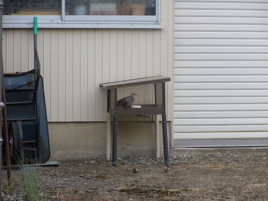 キジバトに横入りされたスズメたちは地面に降りて不満げです