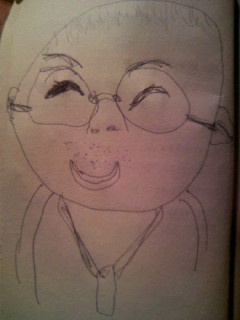 PS 先日、大切な用事で、熊本県に、行っていました。そこでも、素晴らしい出会いが、たくさんありました。その時に、出会った画伯、カレンちゃん(6歳)が、私の似顔絵を、描いてくれました。いやー、特徴がでていますねー。ちゃんと、下げていたペンダントまで、しっかりと、描いてますね。(笑) ↓