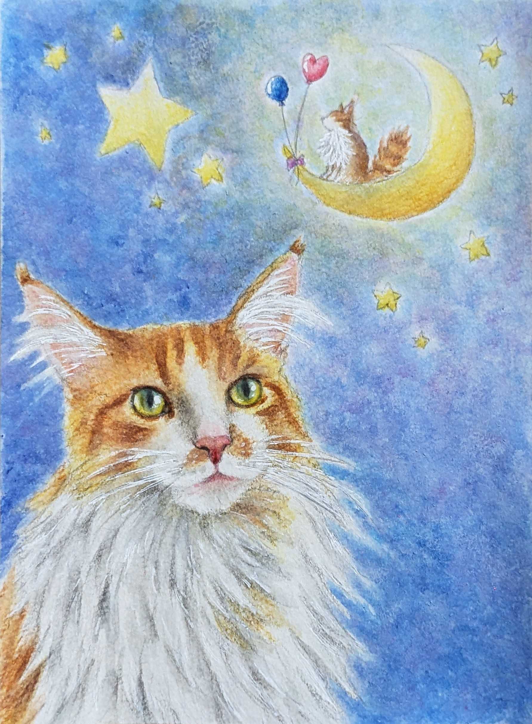 らいむ王子、お誕生日おめでとうあっという間に2歳だにゃん去年と比べるとだいぶ大人っぽくなったにゃ🦁✨これからもずっと健やかに幸せに過ごせますように今回のバースデーカードにはスペシャルゲストも登場なんと、月に乗ってれもん兄さんがお祝いにかけつけてくれたにゃ2歳だから風船は2個だって(笑)🎈🎈いつもながら愚筆で申し訳ないけど少しでも気に入ってもらえたら嬉しいな