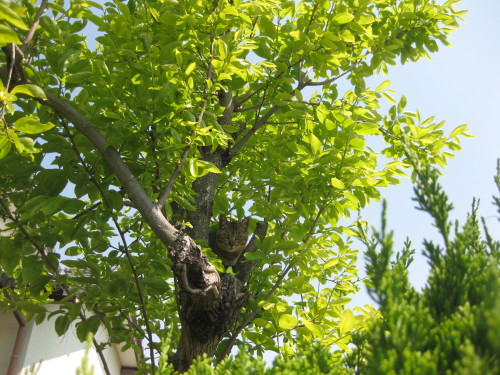 こんばんわ^^ 朝夕は、まだ冷えますが><昼間は、急に暑くなりましたね 三男坊の”コテツ”、木登りが得意です こんなに小さくて…か弱かったのにね 三匹の中では、一番食欲があり!好き嫌いもありません そろそろ、一歳の誕生日を迎えます★ 捨て猫だったので、正確にはわかりませんが><、病院に通い、お兄ちゃん猫”ゴマ”の愛を受けて、 こんなに立派になりましたよ~^^ それでは、みなさんおやすみなさい・・・・ZZZ