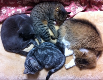 くつした♀ チムチム♂ ゴマ♂ くつした TV観戦中・・ゴマ チムチム じゃじゃ~じゃん! ついに……4匹目のコテツ君の出番となりましたよ~ 数か月前のある日・…・我が家の車庫にそっと置き去りにされていた 子猫が、我が家の三男坊のコテツ!くんです 4匹集まると><何とも言えません^^癒し効果…4倍です★ 最近は、外に出るようになり、なかなか帰ってきません>< どこか、近くに潜んでいるはず!なので、待ってみることにします・・・・ では、おやすみなさい~★