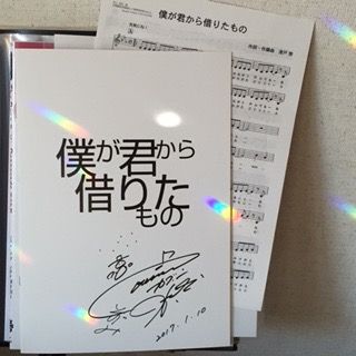 先日も、このブログでYou Tubeの動画を、ご紹介した歌です。今日、頼んでいた譜面が届きました。なんと、カズンのお二人の直筆サイン入りでした!そんなプチ感動もさながら・・・この表紙の裏には、この曲が生まれるまでのことが書いてありました。広島、長崎の被曝から60周年を迎えた2005年に広島廿日市で行われた「平和プロジェクト」に参加した時のこととか。今から、もう10年以上も前の話。その頃は、まだ、東日本大震災も熊本震災もなかった・・・。曲を作るにあたり、作者は広島の子供達と触れ合う機会があり、広島の子供達は、平和への意識が強く、明らかに他の地域とは違うものを感じたとのこと。それは、大人達の意識が違うからだと気づいたそうです。。。以下引用します。「(略)長い間受け継がれてきた平和への思いを風化させては いけないと思いました。そう、未来を作るのは子供達であり、 大人達なんだと。 (略)この歌を初めて子供達と一緒に歌った時、そこは平和の空気、 未来の空気でいっぱいになりました。(略) ♪空に光るのは 花火がいい!(略)」アメリカ大統領が変わって、不穏なウワサも流れています。戦争のことを知ってる人は、世界中でもほんの一握りになってきました。昨年後半から、世界中でテロが勃発しています。平凡で平穏な日常が何よりも幸せ。それを、改めて思う、思わせてくれました。素敵な歌に出会えたことに心から感謝です。僕が君から借りたもの白い魚が浮かんでる青い青いどこまでも広がるこの空精一杯に生きること君と笑顔で話せること何もかもが素敵な僕の宝物かけがえのない友達を どうか奪わないでほしい空に光るのは 花火がいい!君のために 君のために僕のために 夢のために笑いながら 歌いながら僕らは愛を考える僕が君から借りたものすべての流れが辿りつく深い深いどこまでもつながるこの海思い描いた未来も神に書き出せば過去の文字胸に強く願いを描けばいいきっと時間は何にも 解決なんてしないさ誰かがちゃんと 頑張ってる何のために 何のためにそれは君に 出会うために悩みながら 歌いながら僕らが未来をつくる