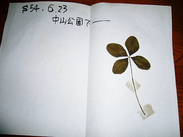 今日、古い本棚を整理していたら、小学生当時の本が出てきた。それだけでもかなり驚きでしばらく見入ってしまったのだけど、なんともーーーっと驚いたのは四葉のクローバーの押し花?が出てきたのだ~@@つたない子供の字でS54・6・23と書いてある。ひぇ~今から27年前?????きゃ!!すごい!感動@@@思いがけない四葉のクローバーになんか懐かしくって、うれしくって^^。なんか子供の頃のピュアな心が思い出されて(笑)まさかその頃はこの年にみて感動するなんて思わなかったよなぁ~どういう気持で押し花にしたかは忘れましたが^^;;さすがに・・・なんだかいいことしてたじゃん!私ったら~♪
