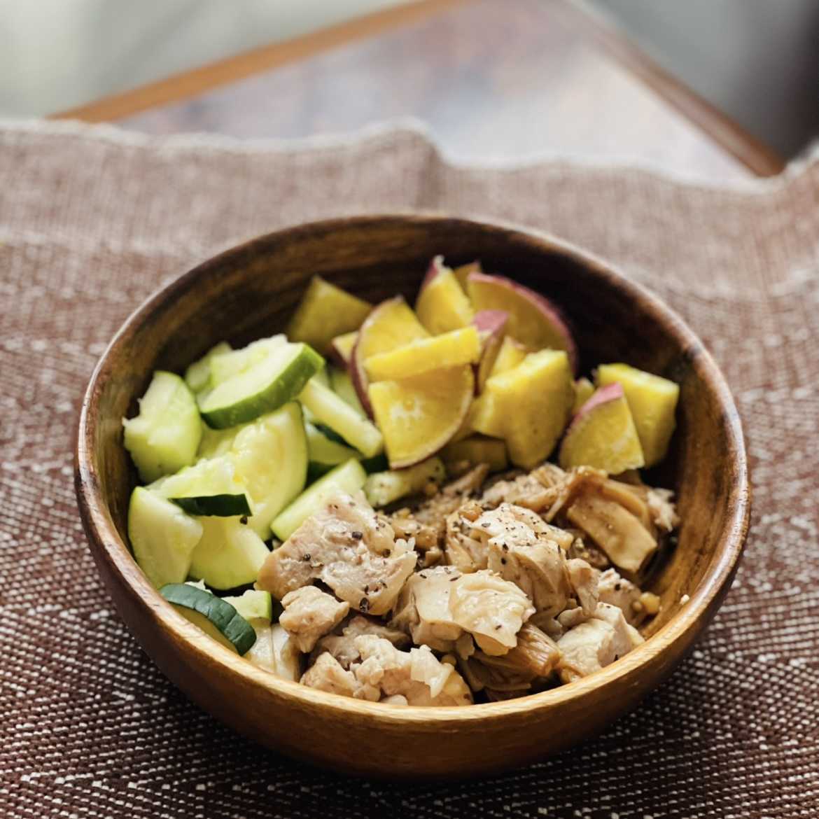 朝:サラダボウル(ズッキーニ、さつまいも、鶏もも、きのこ)