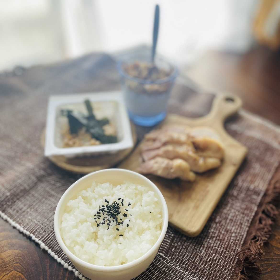 昼:ご飯、納豆、鶏もも肉の低温調理、ヨーグルト(自家製グラノーラ添え)