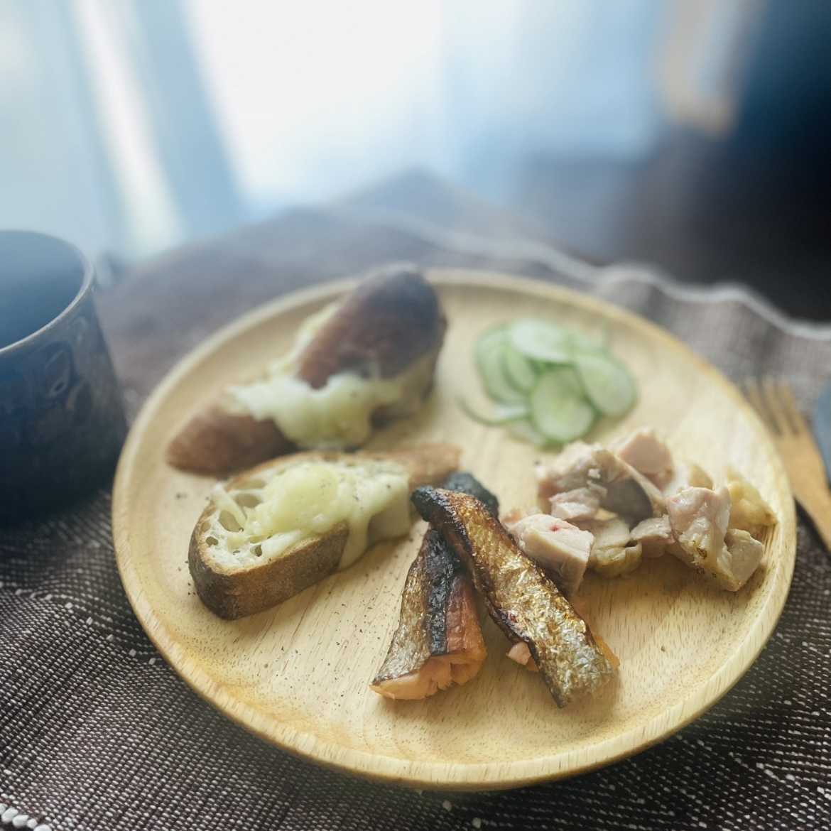 朝:フランスパン、チーズ、鶏もも肉の低温調理、鮭の西京焼き(端っこ)