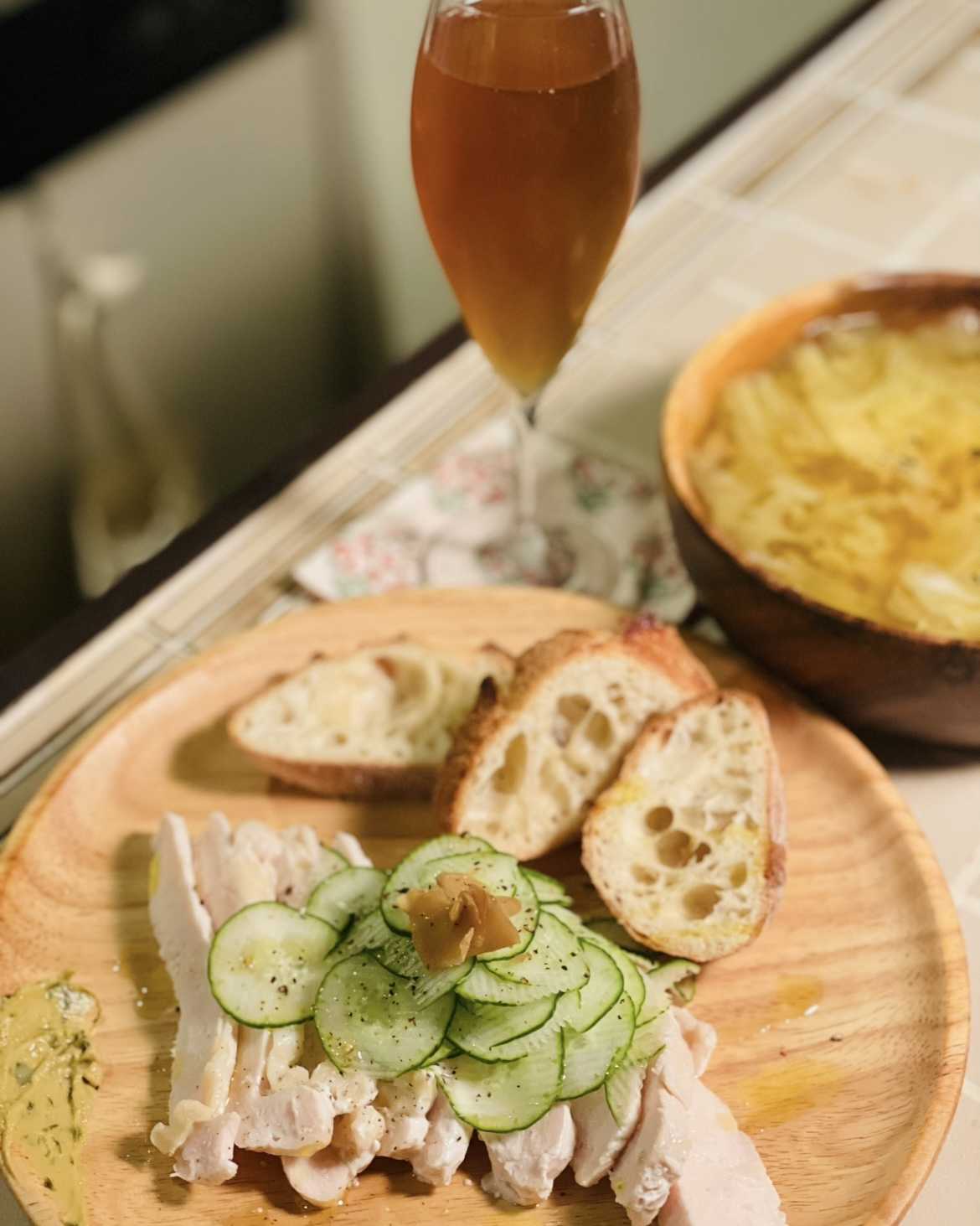 夜:鶏胸肉の低温調理、キャベツのカレー風スープ、自家製ジンジャーシロップの炭酸割り