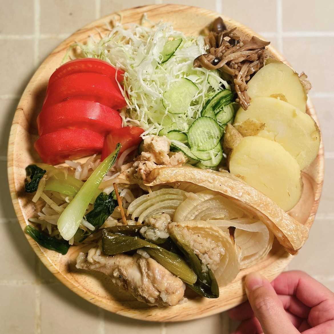 夜:キャベツの千切り、きゅうりスライス、もやし、トマト、きのこマリネ、青梗菜の炒め、ジャガイモ、玉ねぎとサーモンはラスのオーブン焼き、参鶏湯(鳥手羽元肉1本)