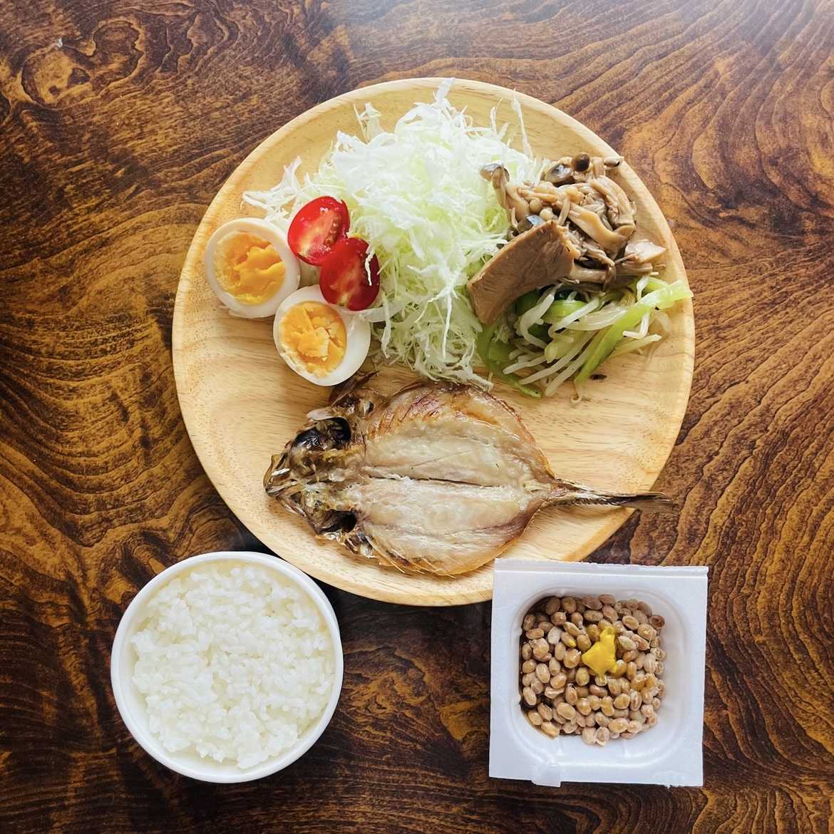 朝: ①キャベツの千切り、トマト、味玉、きのこマリネ、青梗菜炒め、味の開き、納豆、ご飯