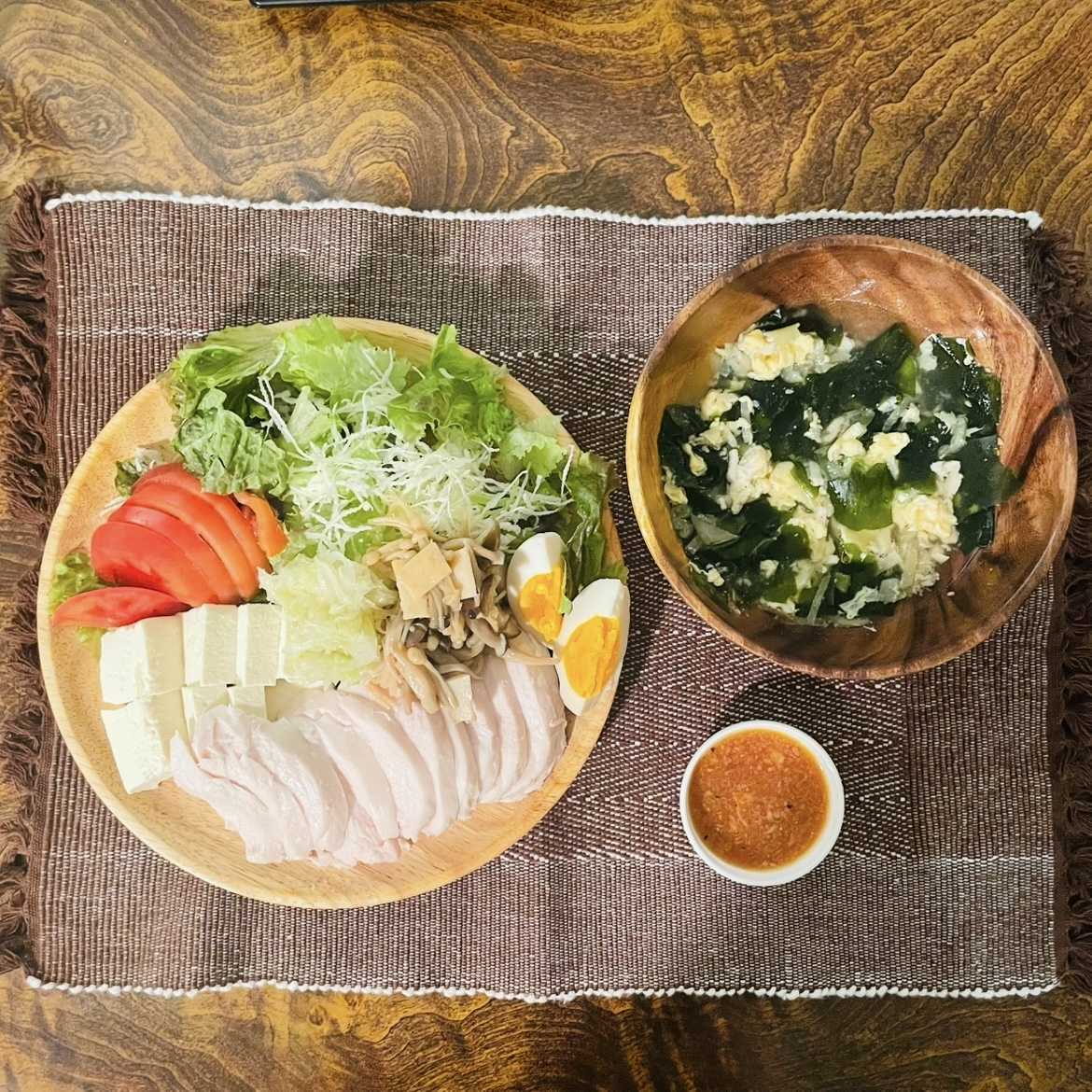 夜:鶏ハム、トマト、キャベツ、レタス、キャベツのマリネ、きのこマリネ、味玉、木綿豆腐