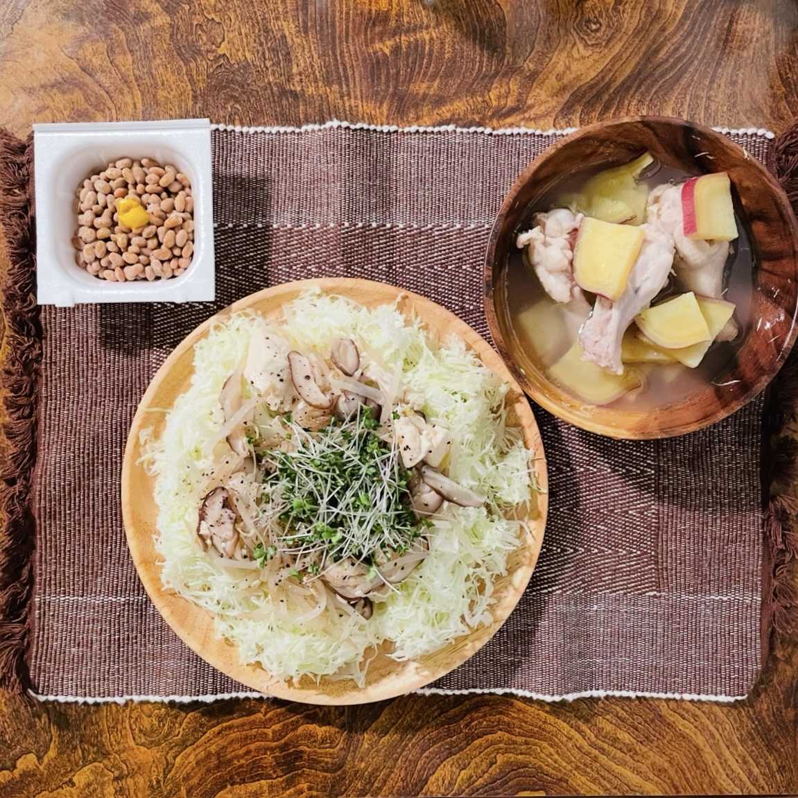 夜:あんかけサラダ、鶏手羽元とさつまいものスープ、納豆