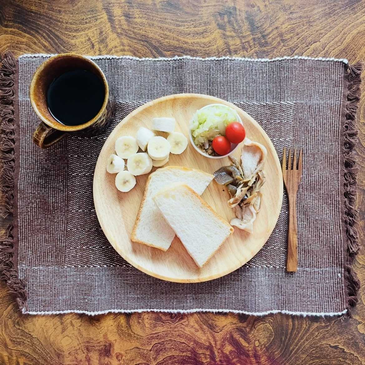 朝:食パン、キャベツのマリネ、ミニトマト、こんにゃくの煮物、豚の生姜焼き風、バナナ