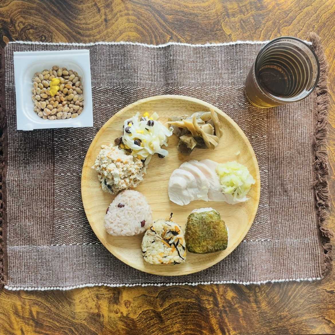 昼:ミニおにぎり3個、白和、玉ねぎサラダ、蒟蒻、鶏ハム、納豆