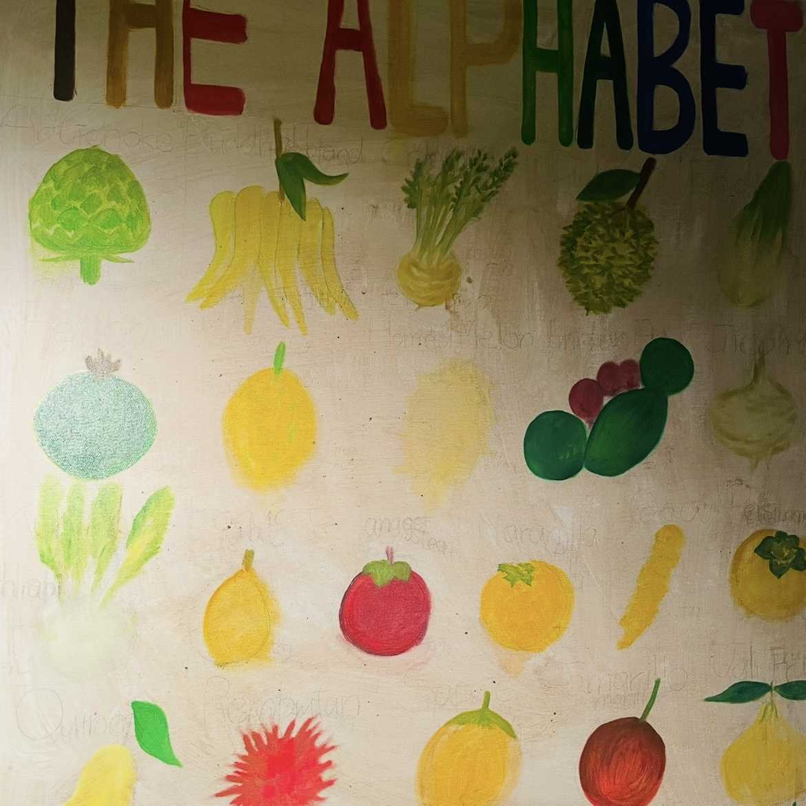 今日は、F25号ー約80×60cmの大きなキャンバスに「世界の果物と野菜のアルファベットポスター」を描いている。