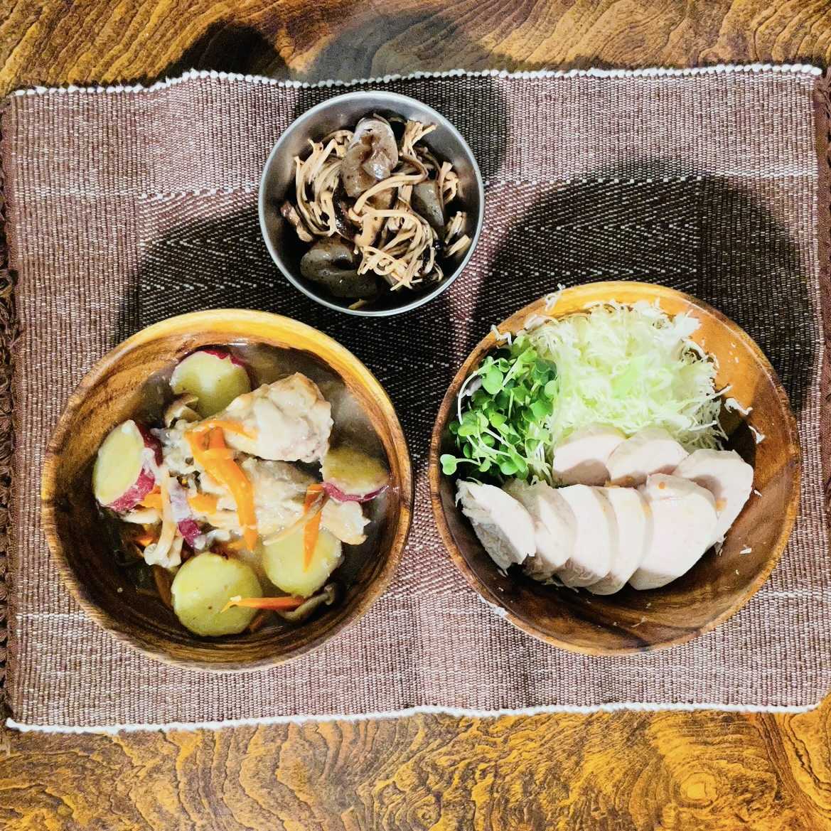 夜:鶏手羽元とサツマイモのスープ、キャベツ千切り、鶏ハム