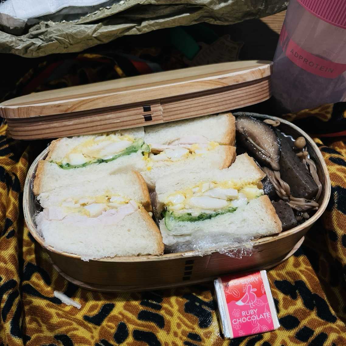 昼:サンドウィッチ(卵きゅうりとハム卵)、プロテイン