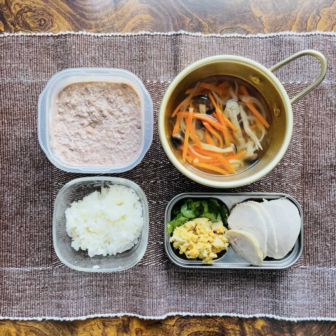 朝:ミニカオマンガイ、サンドイッチの具材の残り(きゅうり、たまご、鶏ハム)、コンソメスープ、オーバーナイトオーツ