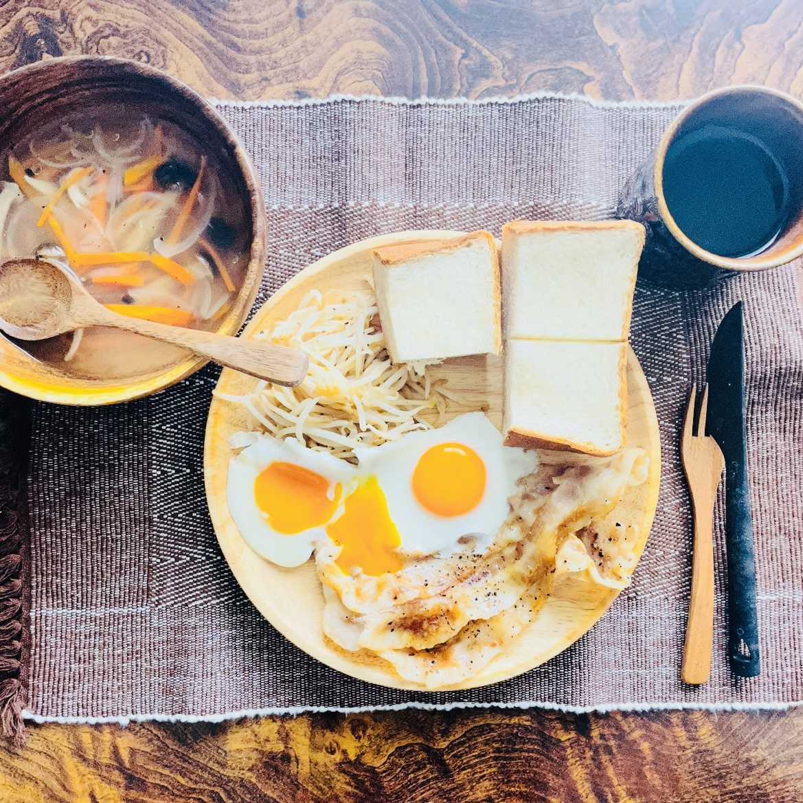 朝:食パン、目玉焼き、豚バラソテー、コンソメスープ、もやし炒め