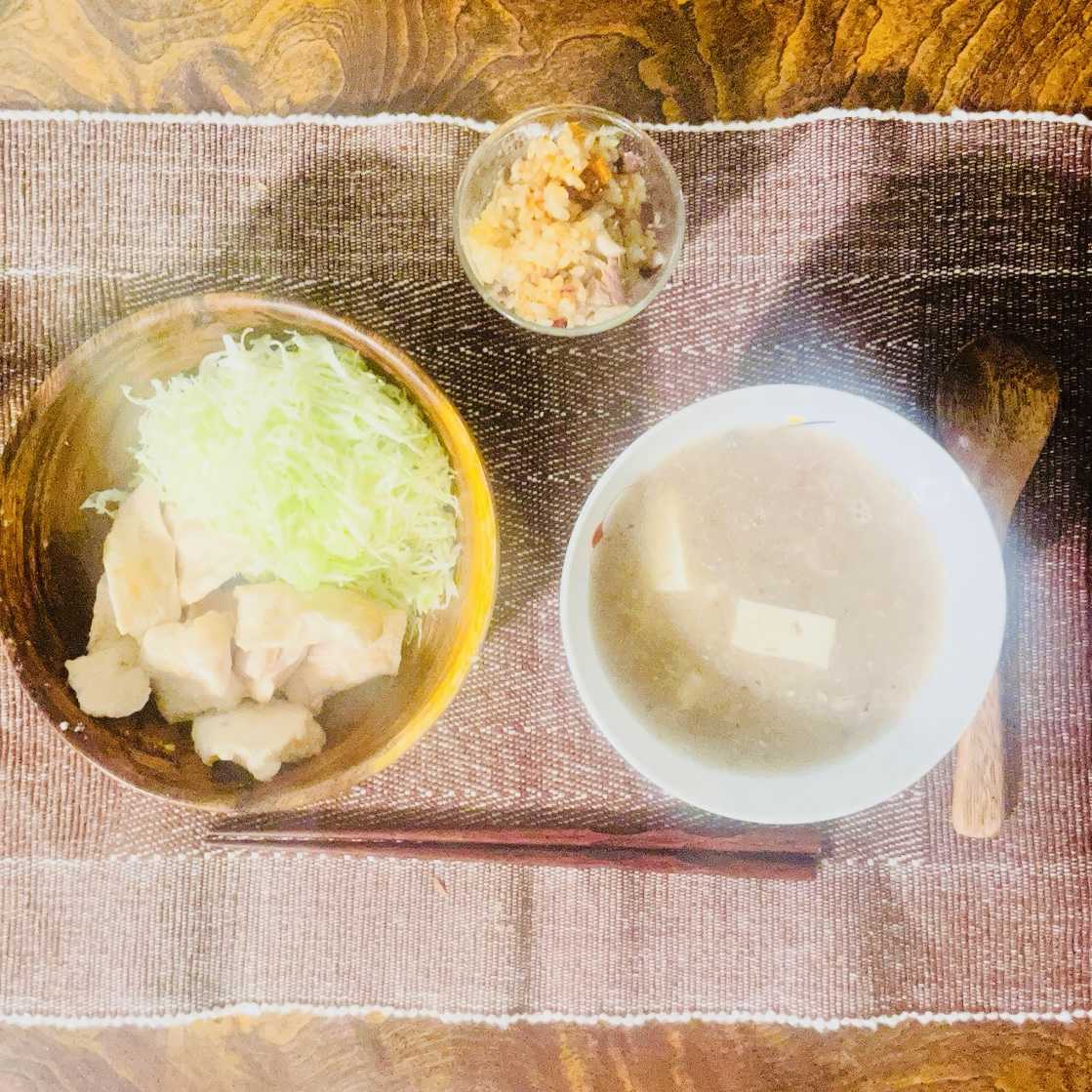 夜:つみれ汁、鶏胸肉、キャベツの千切り