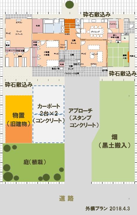 車庫床はコンクリート+目地砂利(又は砂利なし)で、アプローチはスタンプコンクリートだと