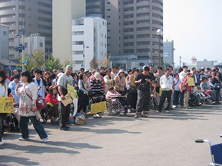 一つのものを見るとき、いろんな角度から見れるようにしなきゃ!!て、いつも思っているのに、今日・・・・・新たなショックを受けた。今日は姫路からひまわり号という障害者の方をのせた電車が高松に着いた。お世話される方を含めて総勢230名。その方々においしい讃岐うどんを食べさせてあげたい!!というボランティアに参加してきた。そして、おうどん、いなり寿司食べたあと、 障害者マップをつくろう!!ということで、駅構内や、サンポートなどを車椅子の方々と歩いてみた。そこで・・・・・・いつも通っている道が斜面になっていること横断歩道の信号が青から赤になるまでの時間の短さ・・・・などなどに驚いた。高松駅や、サンポートは、まだ新しいだけに、それでもバリアフリーが行き届いている。障害者用のトイレも広く、たくさんあった。 和式の障害者用トイレがあったのにはもう驚きだった。でも・・・・やはり完璧ではないのだ。例えば、銀行のATM機は、車椅子の方では、ボタンまで手が届かない。エレベータのボタンも下方向は届いたも、上方向になると、少し高すぎるなどなど・・・そして、障害者用の駐車場。健常者が止めないように、コーンなどを置いているが、実際に障害者の方が駐車しようとしたときにそれは誰がどけるんじゃ~~!!などなど・・・・ほんと、これは、どれも健常者の目線でしか考えれてないことがたくさんあるな~と思った。障害者の方の中にも、いろんな障害の程度があり、それぞれやっぱりできること、できないことが違うのだ。そんなことを一緒にサンポート周辺をまわってすごく感じた。。というか、そんなことに今までぜんぜん気がついてなかった自分に、今日はじめて気がついた。