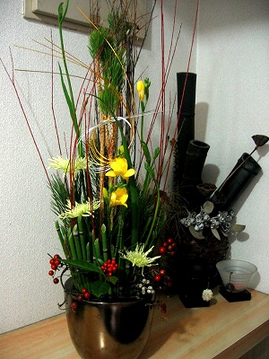 今朝お正月用のお花のアレンジをいただいた。 うじこさんが作ってわざわざ届けてくれたのだ。 とくさをいっぱいアレンジしてた。うじこさんには3年前に出会ったんだけど、自然のお花や草の素敵さをいっぱい教えてもらったア~。ウエディングやパーティのアレンジも素敵だけど、自然に咲いている花や緑の何気ないアレンジが好きです。 うちの玄関もおかげてお正月らしくなりました。ありがとうございましたあ