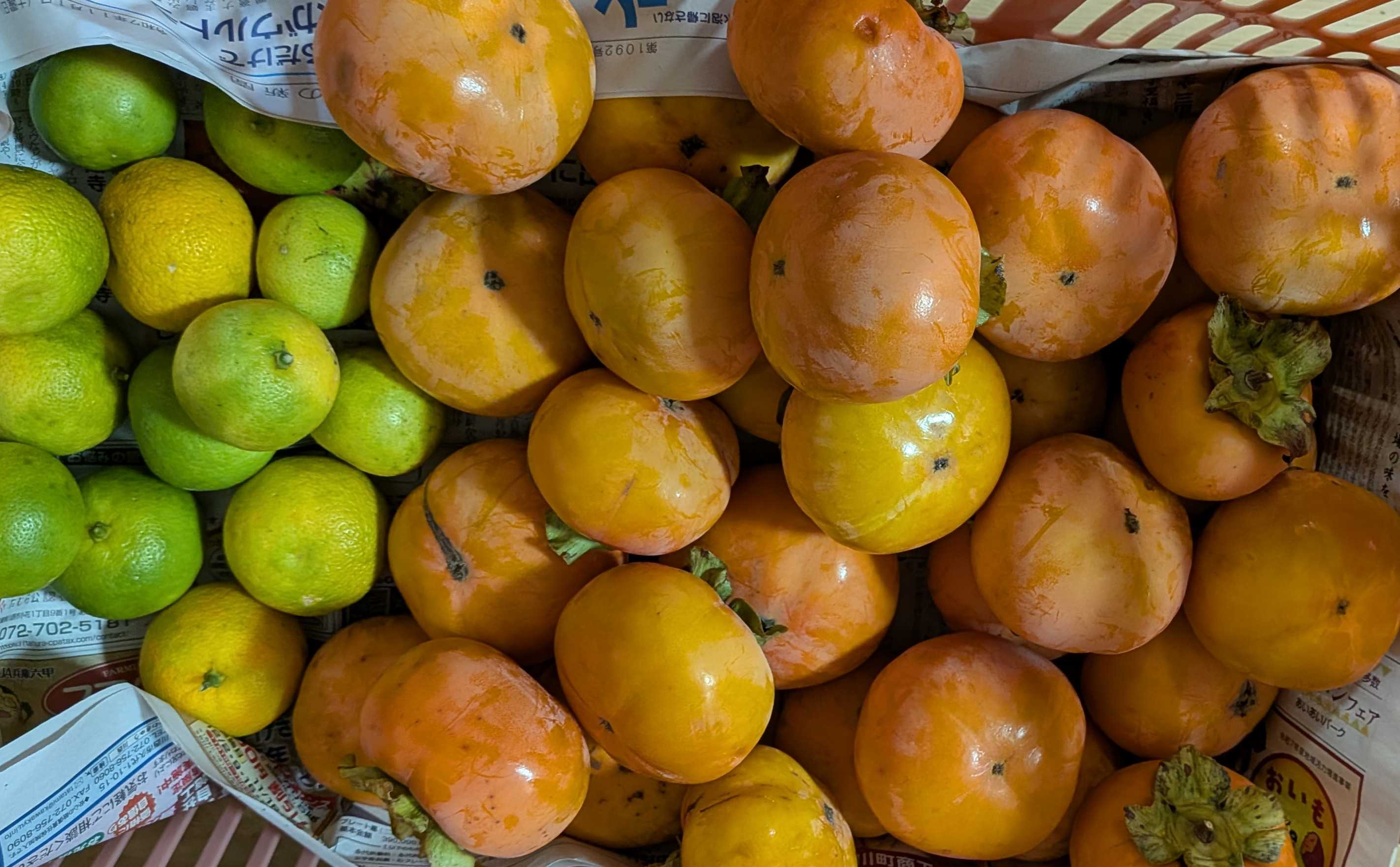 朝 めざめて 浮かんだ『かき』という言葉次に出てきたのが「柿の木坂の~~」と歌ってました なんで こんな古い歌が出てくるんかなぁ、、それはですね アンタが 古~~い人間やからです ハイそうそう思いだしました昨日のことです お隣さんが回覧板を持ってきてくれて そこでの立ち話いろんな話をした最後に「柿 食べる?」と ありがたいお言葉が出てきましたすでに 我が家は お隣からスーパーのカゴ 2杯分くらいの柿を もらってるんですなので「もう無くなってん」とは言いづらくただただ 隣の柿の木を眺めては「まだ赤い柿が見えるなぁ」と、、、思う毎日そこで 昨日のありがた~~~い「柿 食べる?」のお言葉断る気なんて まったくない私というかそのお言葉を 待ってました 来たかチョウさん まってたホイです「ありがたく ありがたく頂戴します」と即答そしてカゴを渡しました枝付きの柿なので 枝を取って柿だけにその結果がこれ 『おいしゅうございます』の言葉がでましたオイオイ これって そうそう あの人の、、岸朝子さんの、、セリフやないのって ええ時代でしたなぁ、、、昭和ですなぁ、、たぶん ホンマにこれが今季最後の柿となりそう大事に食べなければ、、と言いながら むしゃ食いしてますそこで1句 実を取られ 次の春への 冬支度 なんちゃって柿の木坂の家の歌詞に春には柿の花が咲き、、とあります 柿の花って見たことありますか?めっちゃ地味な花です赤や黄色の花ではなく緑色の花ですあれでも花と言うんですねと まぁしょうもないイチャモンをつけていますが歌ってください今にはないゆっくりテンポの「柿の木坂の家」 柿の木坂の家 ← 春には 柿の花が咲き 秋には 柿の実が熟れる 柿の木坂は 駅まで三里 思いだすなァ ふる里のョ 乗り合いバスの 悲しい別れ