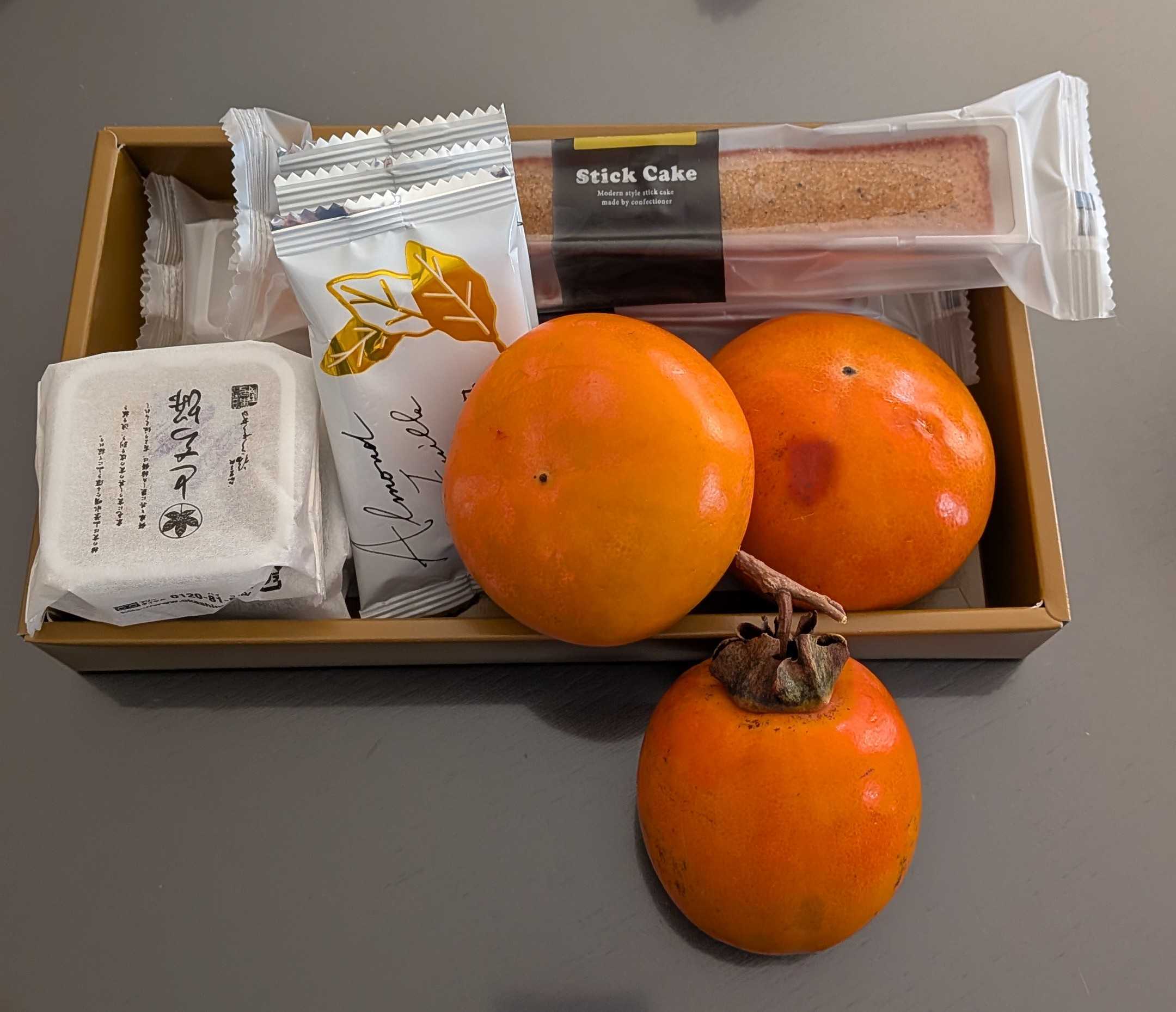 今日が”月1のおしゃべりタイムの日”体調不良で 欠席したらメンバーの一人が運転できるのでお昼過ぎに おやつをとどけてくれました 今回は なんか すごぃ りっぱなお茶菓子ばかりきっと どこかのお土産ですね気になっているのが 柿富有柿ではない柿が1個早くたべたい気なるわぁ、、