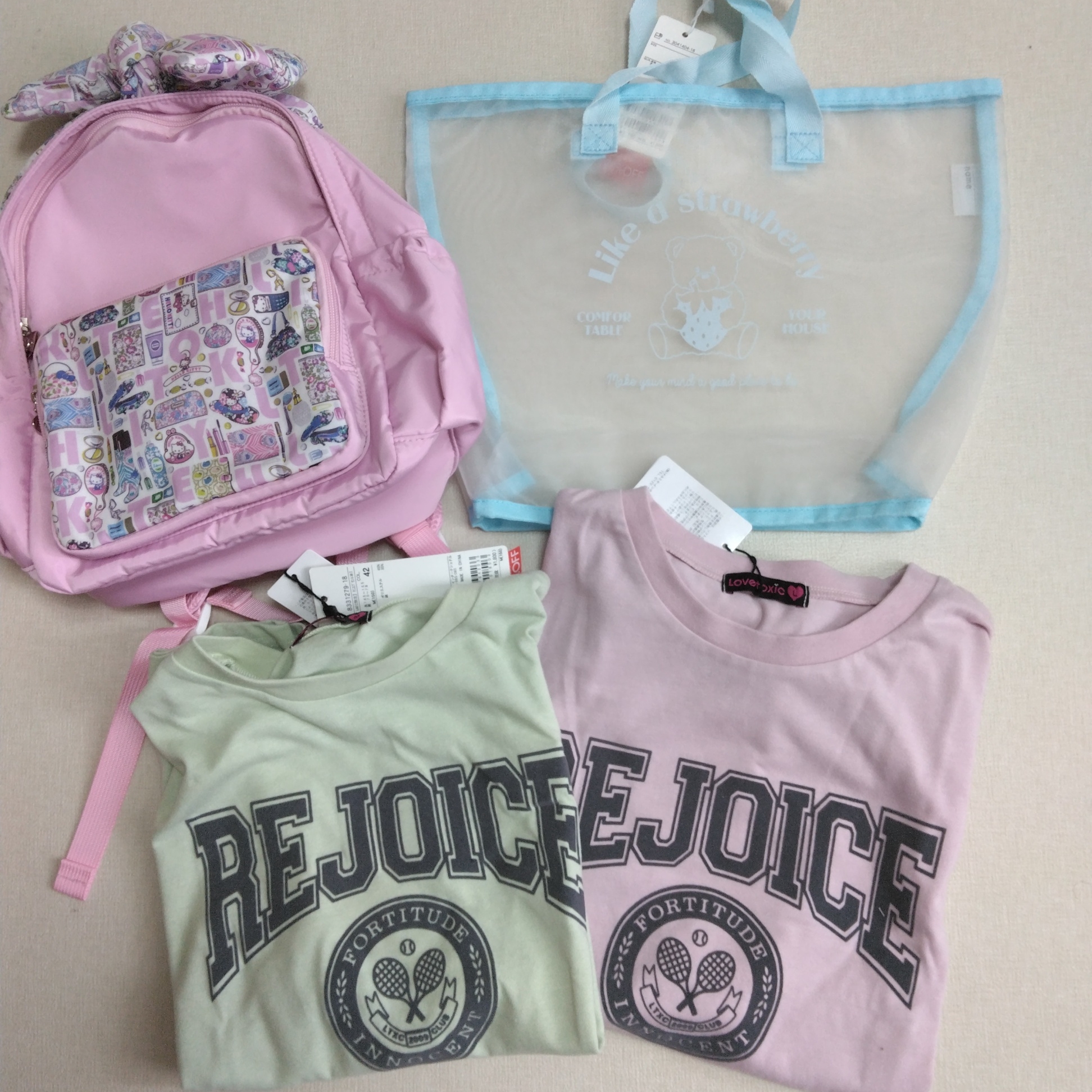 ナルミヤファミリーセールの戦利品です✨過去ログにもナルミヤファミリーセールのお洋服の戦利品を載せています😀入りきれなかったので追加です😄目玉商品?!ラブトキTシャツはなんと90%OFF✨️【アパレルEC別注】テニスプリント半T/ラブトキシック(Lovetoxic)リセマインのメッシュバックは70 %OFF✨️Lycee mine リセマイン 【SWIM】いちごくまちゃんプリントメッシュバッグ かばん 春夏秋 キッズセンスオブワンダーのキティリュックはサンプルで60%OFFすごく迷いましたが、戻せずお持ち帰り😍パンパンチュチュも可愛いな♡panpantutu (p)【マイメロディ/ハローキティ】撥水マルチポケットリュックM B5 パンパンチュチュ バッグ リュック・バックパック【送料無料】【新作】ラブトキシック Lovetoxic パジャマ 女の子 上下セット 【メール便 送料無料】半袖 7分丈パンツ 子供服 ジュニア ラブトキ ルームウェア ジュニア キッズ ブランド 小学生 中学生 修学旅行 合宿 クラブ 旅行 自然教室 林間 140cm 150cm 160cm【メーカー価格4059円】Lovetoxic 2点セット タンクトップ チュールボレロ 英字 シアー 女の子 キッズ ジュニア 夏 半袖 カーディガン 羽織 トップス カットソー シアートップス インナー付き 子供 子供服 ラブトキシック 140 150 160 ピンク 黒 白 8343263