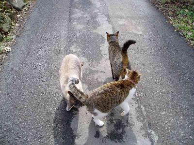 洗濯物を干してたら・・・外に3にゃんが集結(笑)急いでカメラを取ってきて、写真撮影!!今日は3にゃんが揃ってます。と、言っても正面向いてる写真がない(涙)たまには後姿でもいいかにゃ・・・これが一番3にゃんが近くにいました。ガラがトラのおしりの匂いをクンクン(失礼しました~)トラは嫌だったのか・・・一人で歩いて行っちゃった・・・。残された2にゃん。さて、トラは何処にいるでしょう(笑)バレバレですよね(´▽`*)アハハ たまにはこんなクイズ形式も楽しいからしら。
