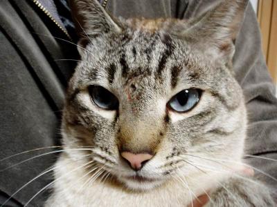 ガラの怪我のその後は・・・少しずつですが前よりは腫れがおさまってきたかな?と思われます。元気も取り戻して跳ね回ってます(笑)まずは一安心です。化膿止めの薬も毎日飲んでるので効いてるのかな?と思われます。前回の写真よりも目が大きく開くようになったんです♪♪ご心配をお掛けしました~。もし、腫れがひかないようなら来週にでもまた病院へ行くつもりです。けど、少しずつ腫れもひいてるような気がするので・・・大丈夫かな?とは思いますが。以前、ぶちゃいくガラですが・・・。早く元の顔に戻るといいね~♪♪゚・*:.。. .。.:*・゜゚・*:.。. .。.:*・゜゚・*:.。. .。.:*・゜゚・*:.。. .。.:*・゜今日は夜までちょっと出かけるので、昨日のコメントの返事などは夜にさせてもらいますね~。夜にまたみなさんの所にお邪魔します(^_^)