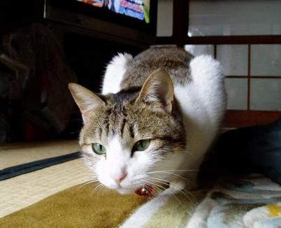 今朝のトラ・・・。この目に勝てる人は果たしているのかしら・・・遊んで♪♪期待の眼差し・・・。それで遊んであげないと・・・じ~~~っと猫じゃらしを見つめます。トラって知能犯・・・だよなぁ・・・。遊び始めるともう誰にも止められない(><)激しく猫じゃらしに攻撃しまくり(笑)でもしばらくすると・・・パタッと倒れます(´▽`*)アハハ そう、疲れてダウンするんですよ(笑)回復するまで猫じゃらしをパタパタしても手で「ちょいちょい」するだけ。持久力がないのかもしれないですね、トラは。最高にうけます(´▽`*)アハハ