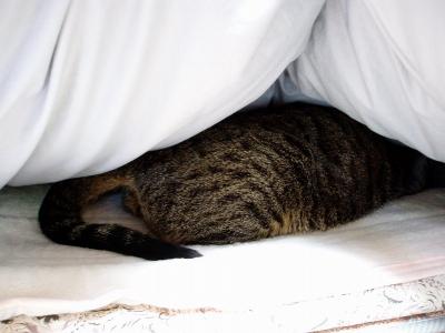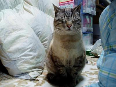 クロは3にゃんの中で一番の寝ぼすけさん。こっちが「いつまで寝てんの!!」と布団をはがす始末(笑)今日も・・・12時まで寝ていたクロ。しかも私の布団の中で。はがしてやりましたとも(笑)寒かったのか向きを変えました。顔は眠くてたまらないって顔。ナマイキ・・・目つきがすごく悪い~(><)
