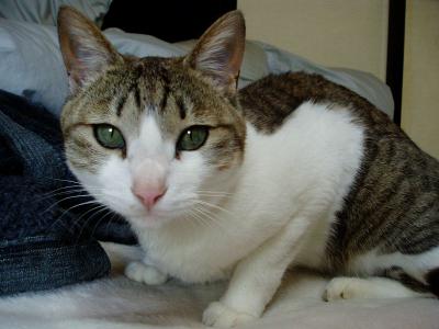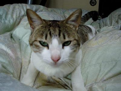 トラはけっこう早起きさん。いつも4~5時くらいに起きて母に外に出して~とせがむらしいそして、帰って来るとたいてい私の所へ来ます。いつの間にか布団の上で寝ている・・・しかも重い(笑)布団の足元の真ん中で寝られるとちょっと厳しいかもまぁそんなことを言いつつそのままなんだけれど。お昼すぎに2階へ上がって行くと・・・トラがまだ寝てました。イジワルをしてちょっと起こしてみると・・・「まだ眠いの・・・目が開かないの・・・」「頑張って起きてみるの」「でもやっぱり眠いの・・・」こんな感じに見えますよね(笑)う~ん・・・楽しいかも~